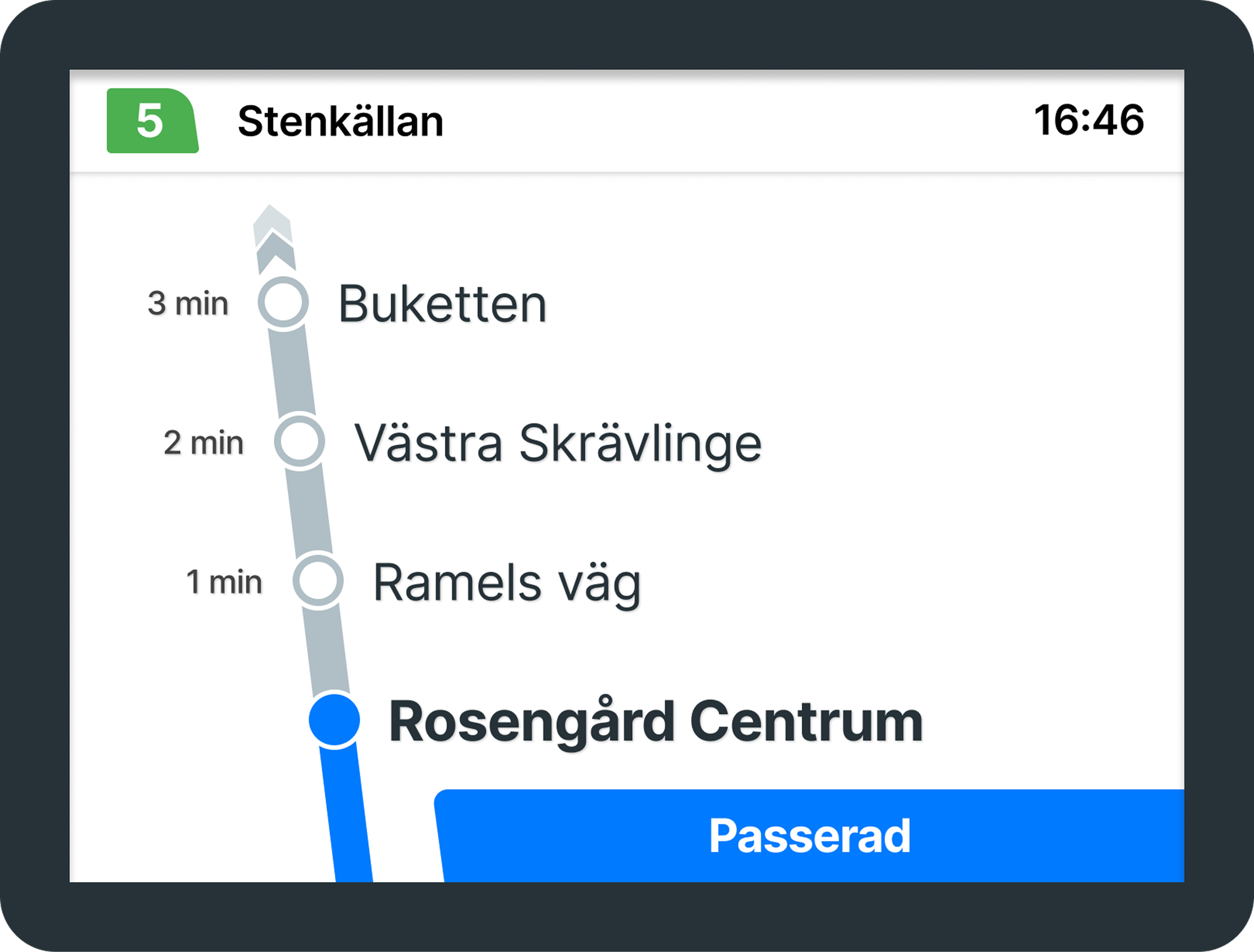 Additionally, adding the label ‘Passerad’ (Passed) for stops that have already been visited would provide better clarity and reduce confusion for passengers.