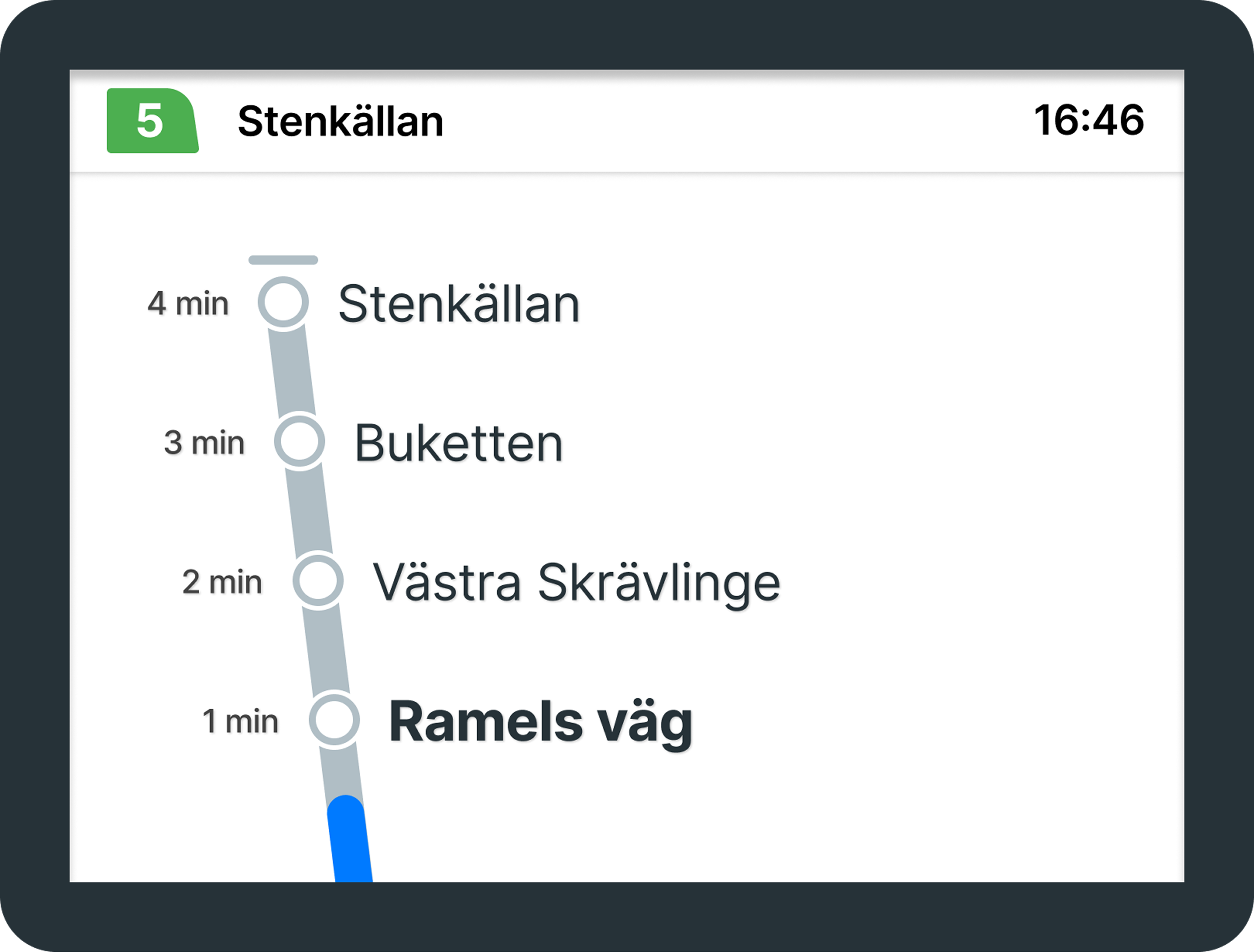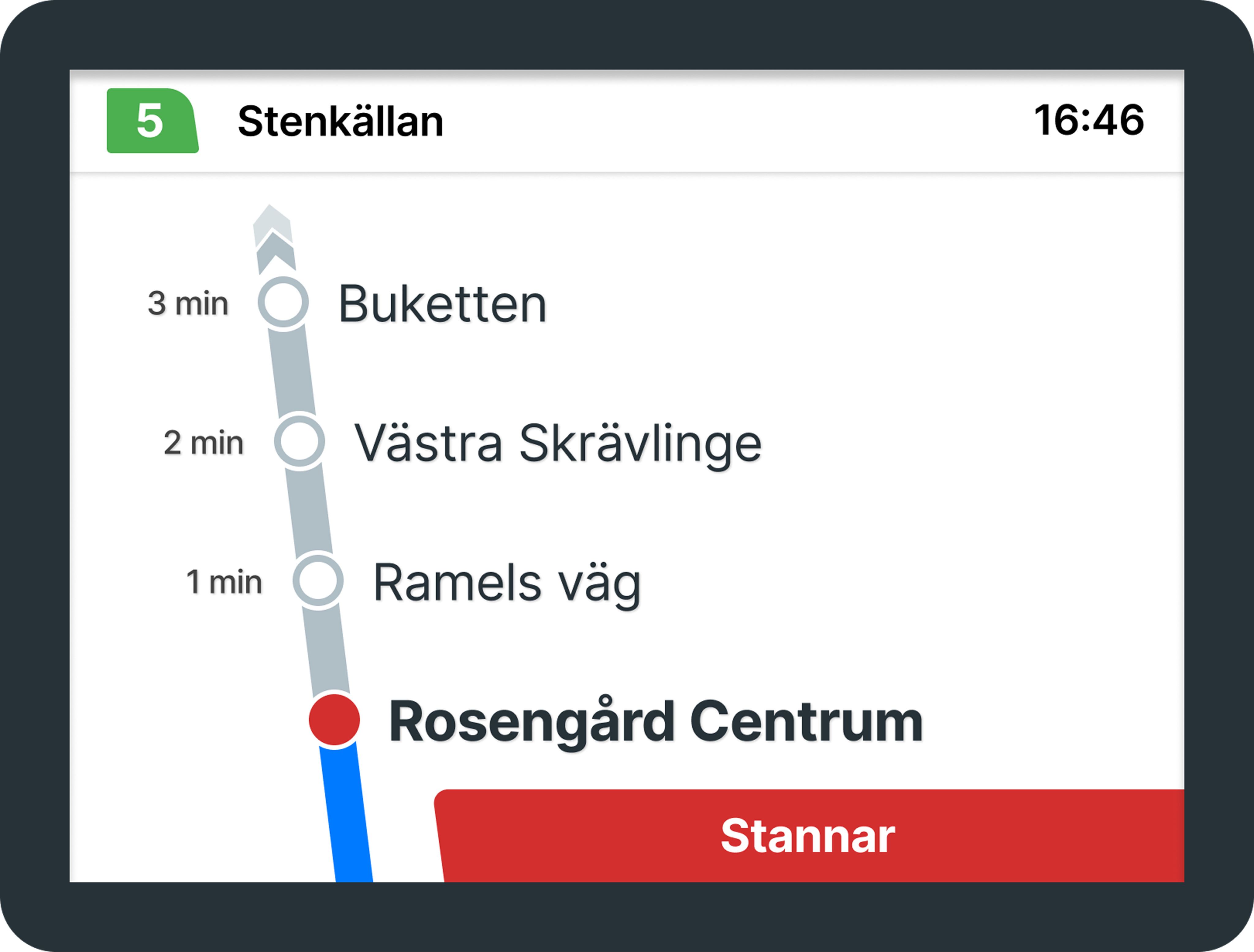 In the bus screen shown in the photo, green is used to represent the route. As the bus approaches a stop, red elements appear: the stop’s empty circle turns red, and a box with the text “Stannar”(Stopping) is displayed.